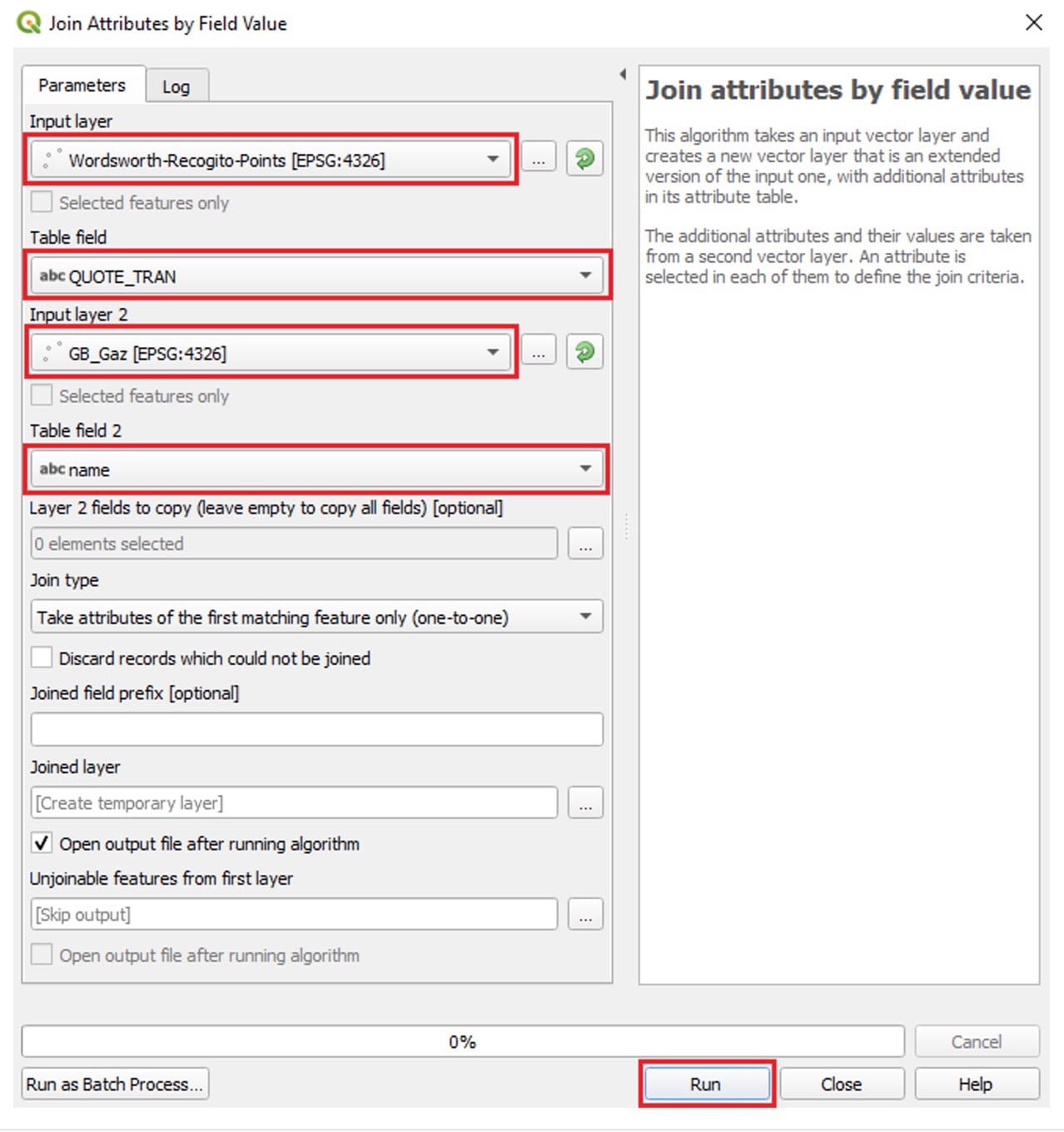 This will open the ‘Join Attributes by Field Value’ dialogue box. For Input layer, select Wordsworth-Recogito-Points, with the Table field as QUOTE_TRANSCRIPTION (this selects the column within Wordsworth-Recogito that contains the annotation you created within Recogito). For Input layer 2, select GB_Gaz, with Table field 2 as name.