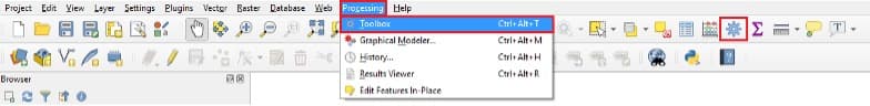 To start manipulating our data, we need to open the Processing Toolbox in QGIS. To do this, you can select Processing > Toolbox from the drop-down menu at the top, or you can click on the ‘gear’ icon highlighted in red below: