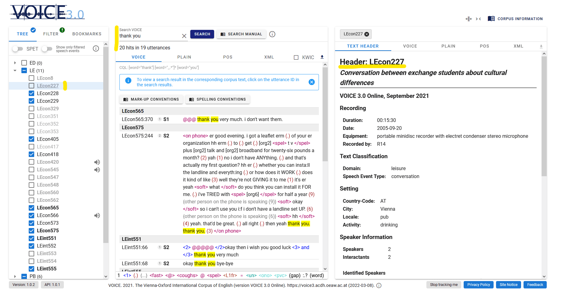 More detailed information on the compilation and history of the corpus can be found on the VOICE homepage or in the VOICE Corpus Header in VOICE 3.0 Online (click “Corpus Information” and select “VOICE Header”).